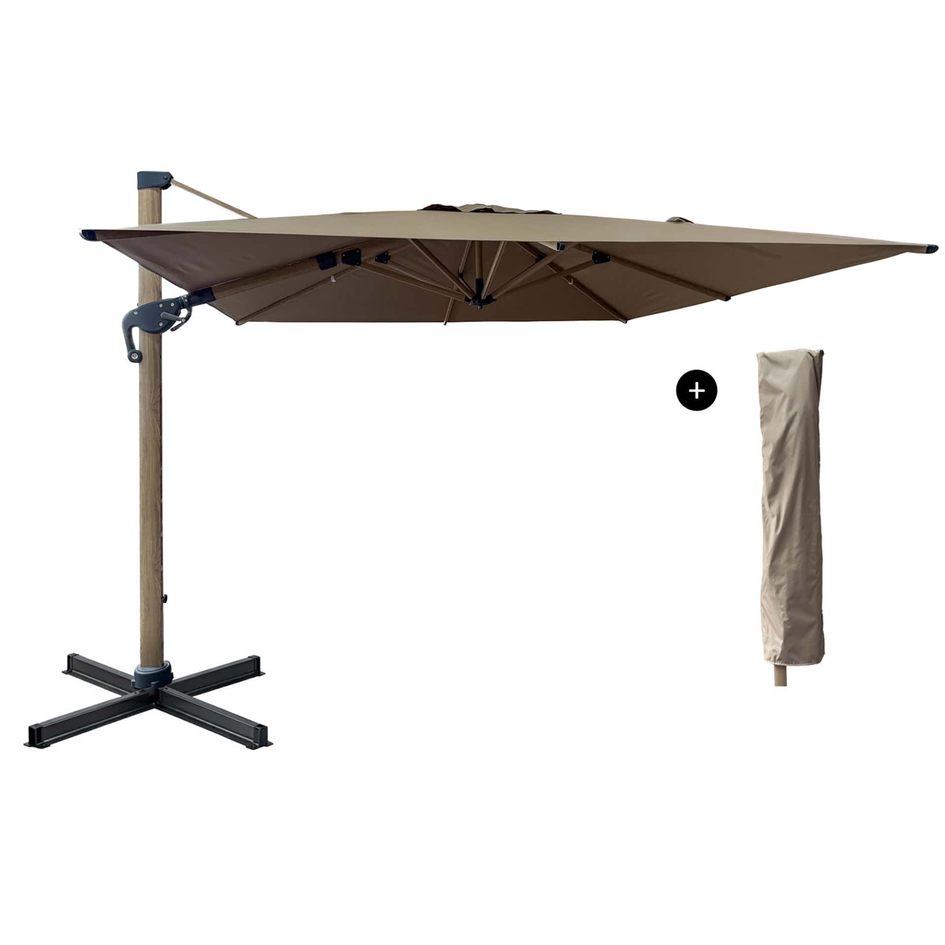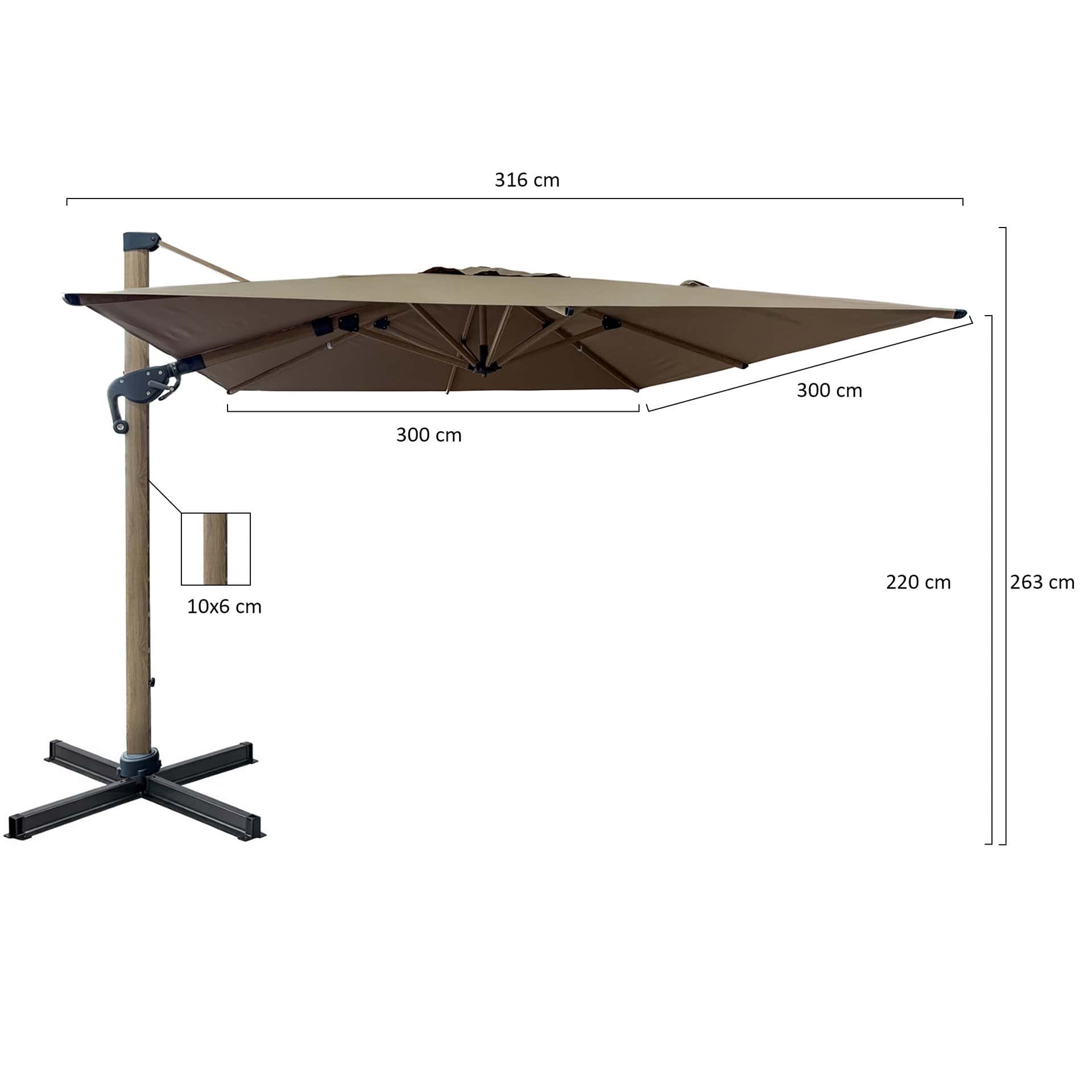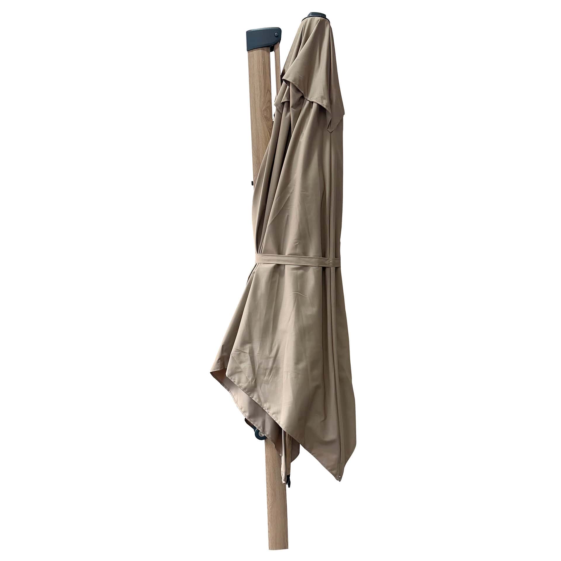 Avec sa forme carrée 3×3 m, ce parasol terrasse restaurant permet de créer une zone d’ombre confortable pour les clients sur les terrasses de restaurants, cafés et hôtels. Sa couleur taupe et son design moderne avec finition wood look s’intègrent parfaitement dans différents styles d’aménagement extérieur.
